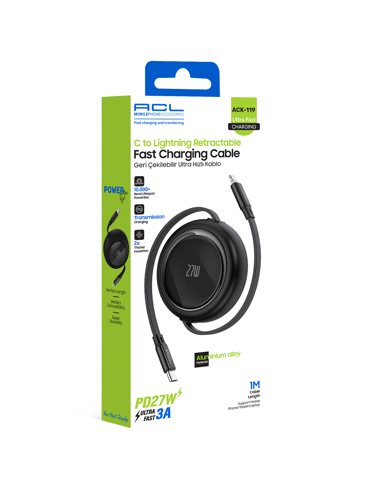 ACL ACK-119, iPhone ve iPad kullanıcıları için kablo karmaşasını tarihe gömen geri çekilebilir tasarımı ile yüksek şarj performansını bir araya getirir. 27W Power Delivery (PD) desteği sayesinde cihazlarınızı en güvenli ve hızlı şekilde şarj ederken, kompakt yapısıyla her an yanınızda taşımaya uygundur.